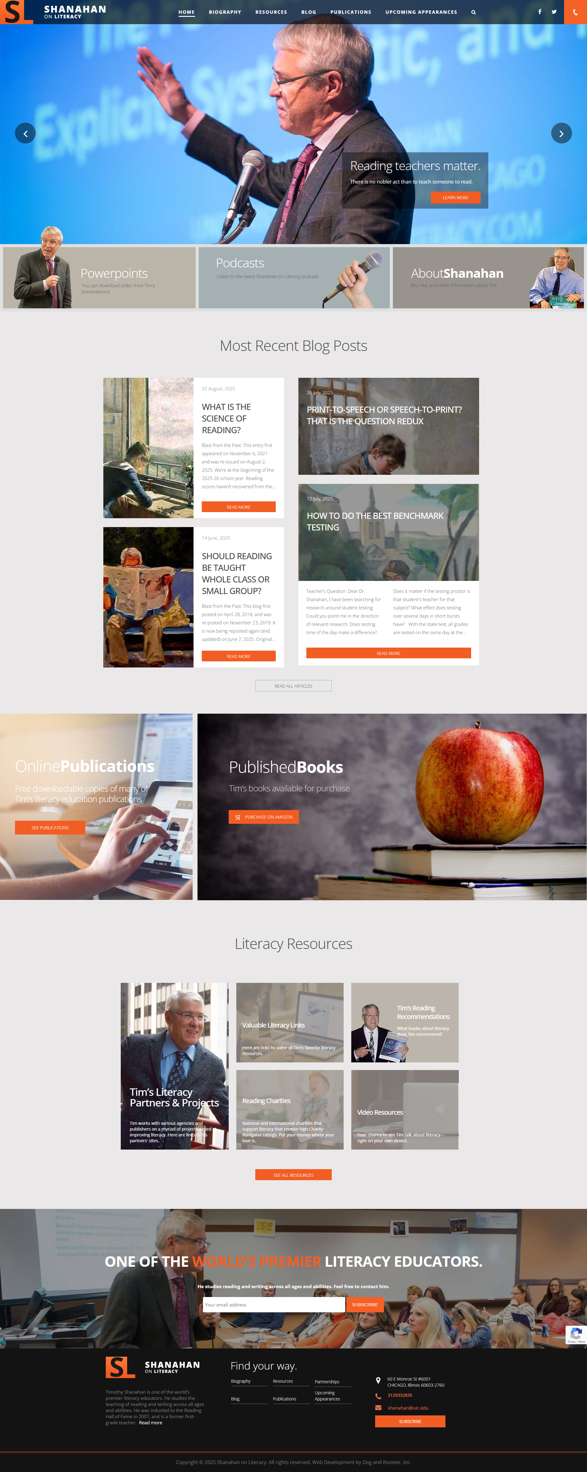 Shanahan Literacy, founded by the esteemed Professor Emeritus Timothy Shanahan, sought the digital expertise of Monte Carlo Web Graphics and Dog and Rooster, Inc., to create a Content Management System (CMS). The aim was to develop a platform that would comprehensively present his prolific work and contributions to literacy education, thereby extending his influence and resources to a broader audience.